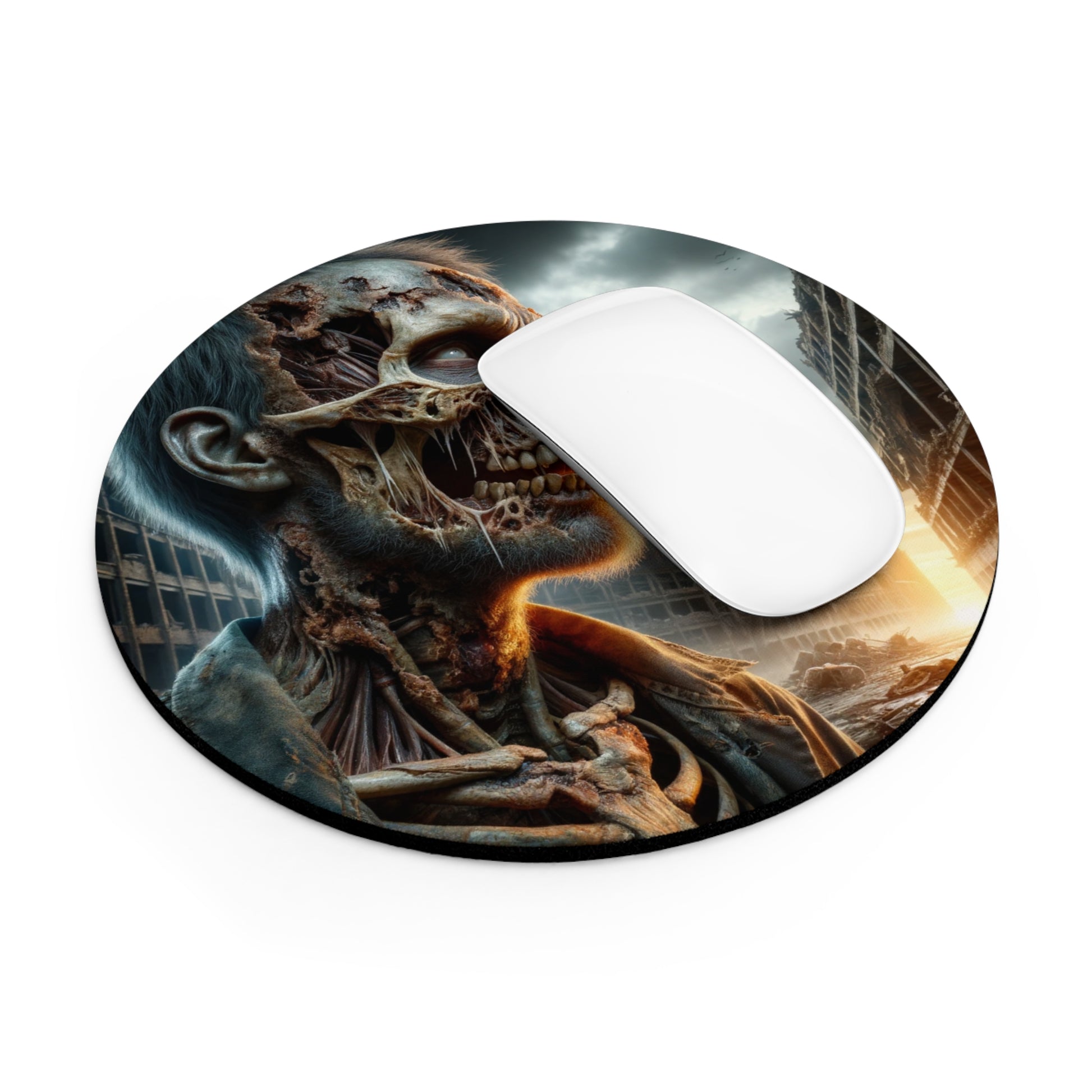 The 'Chronicles of the Undead' mouse pad is a compelling piece that brings the chilling concept of a zombie apocalypse to your tabletop. The detailed illustration captures the eerie gaze of a zombie with a backdrop of desolation, signifying the haunting silence after the fall of humanity. This mouse pad is perfect for horror enthusiasts and fans of the zombie genre who appreciate dark, thought-provoking art. It's a unique accessory that adds an element of the macabre to your home decor, serving as a stark reminder of the captivating stories of survival and horror in the face of the undead.
