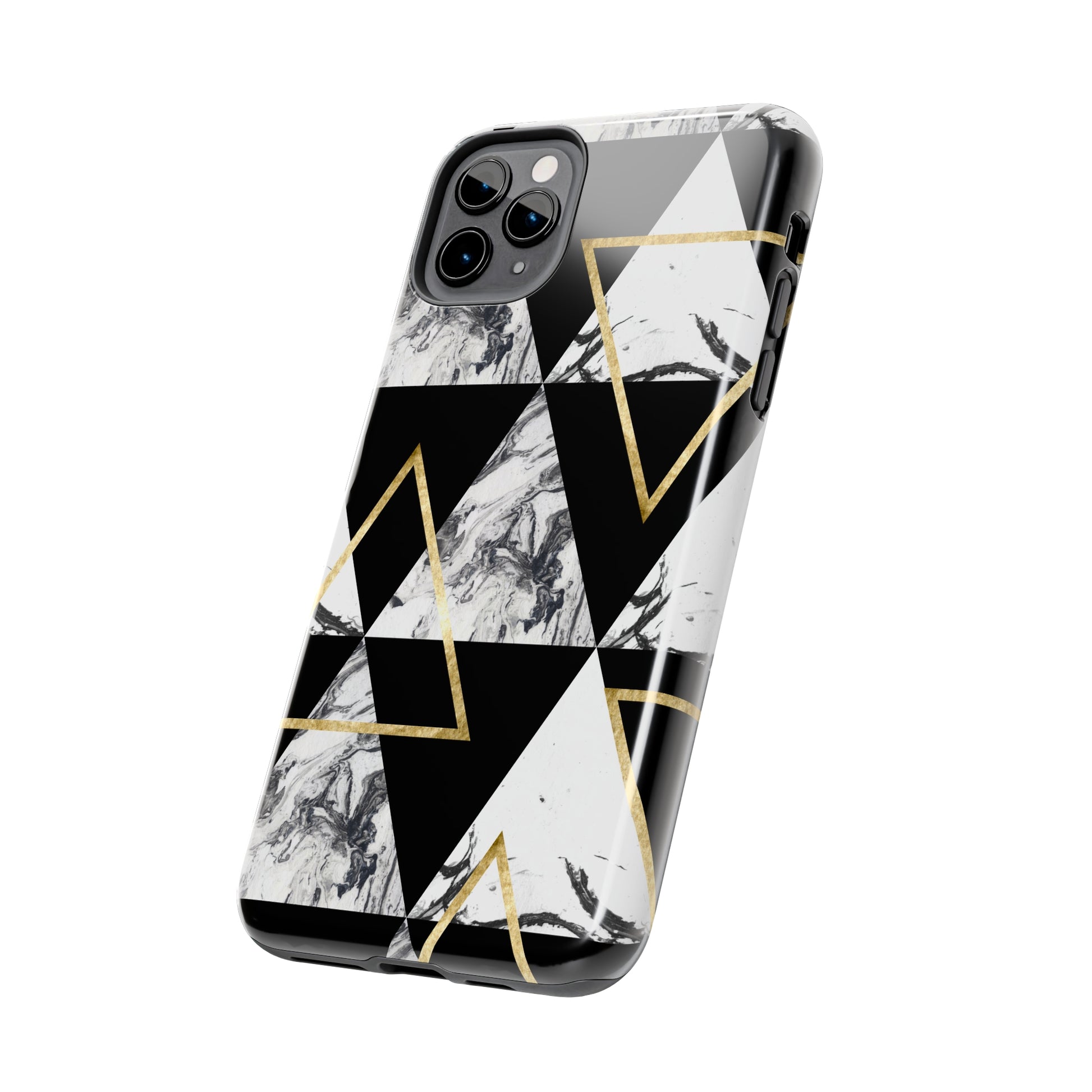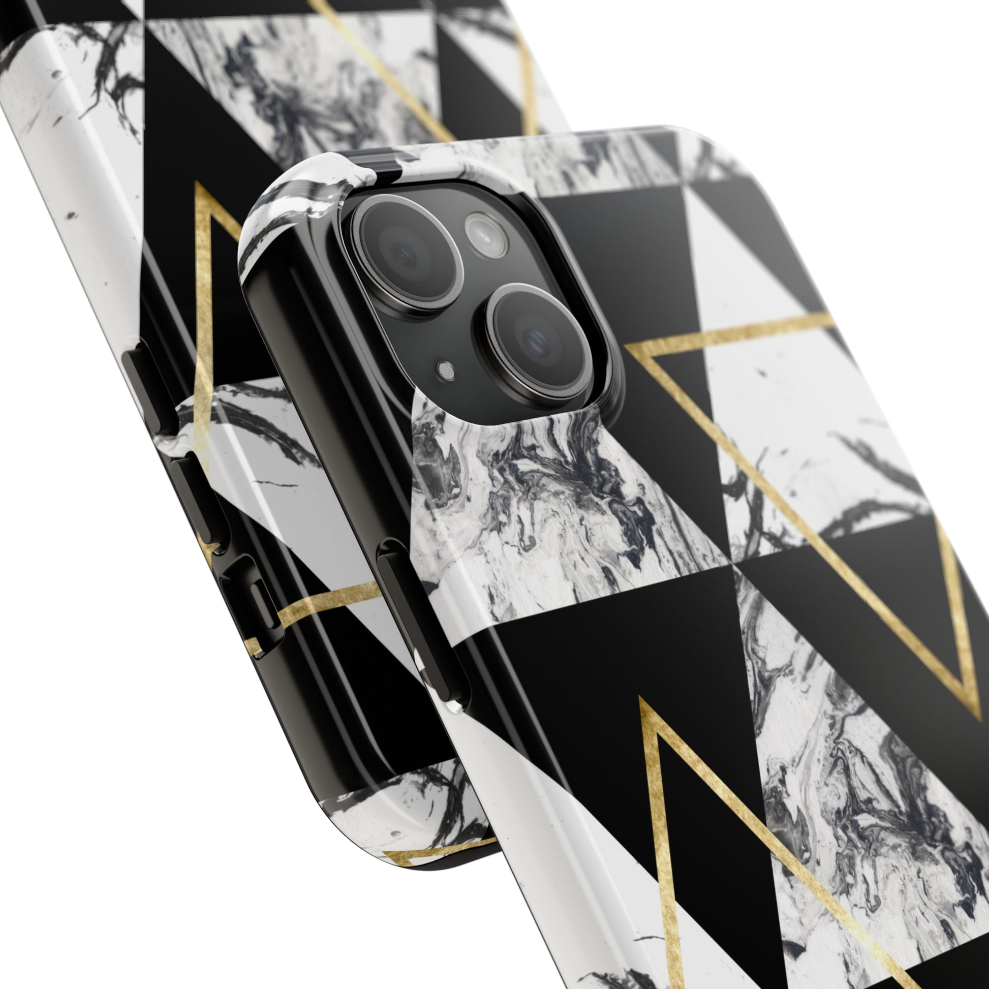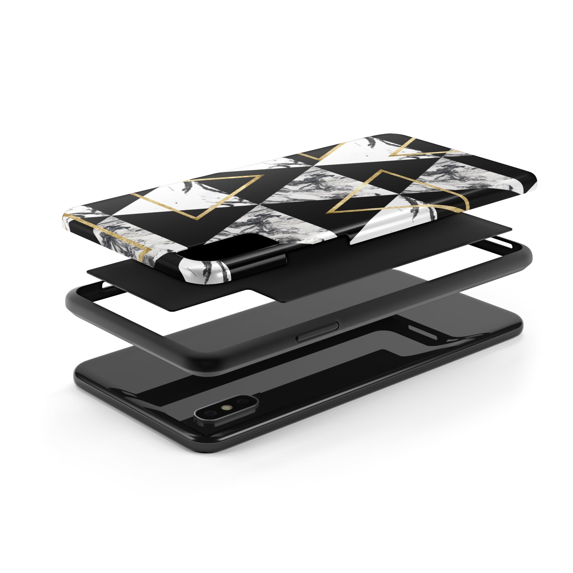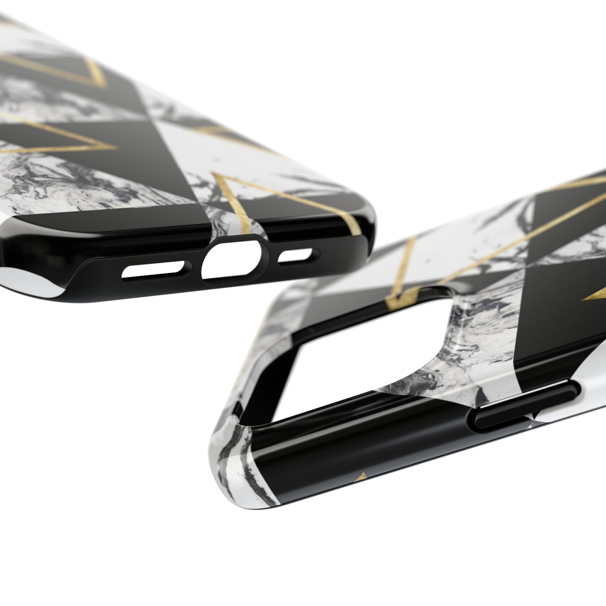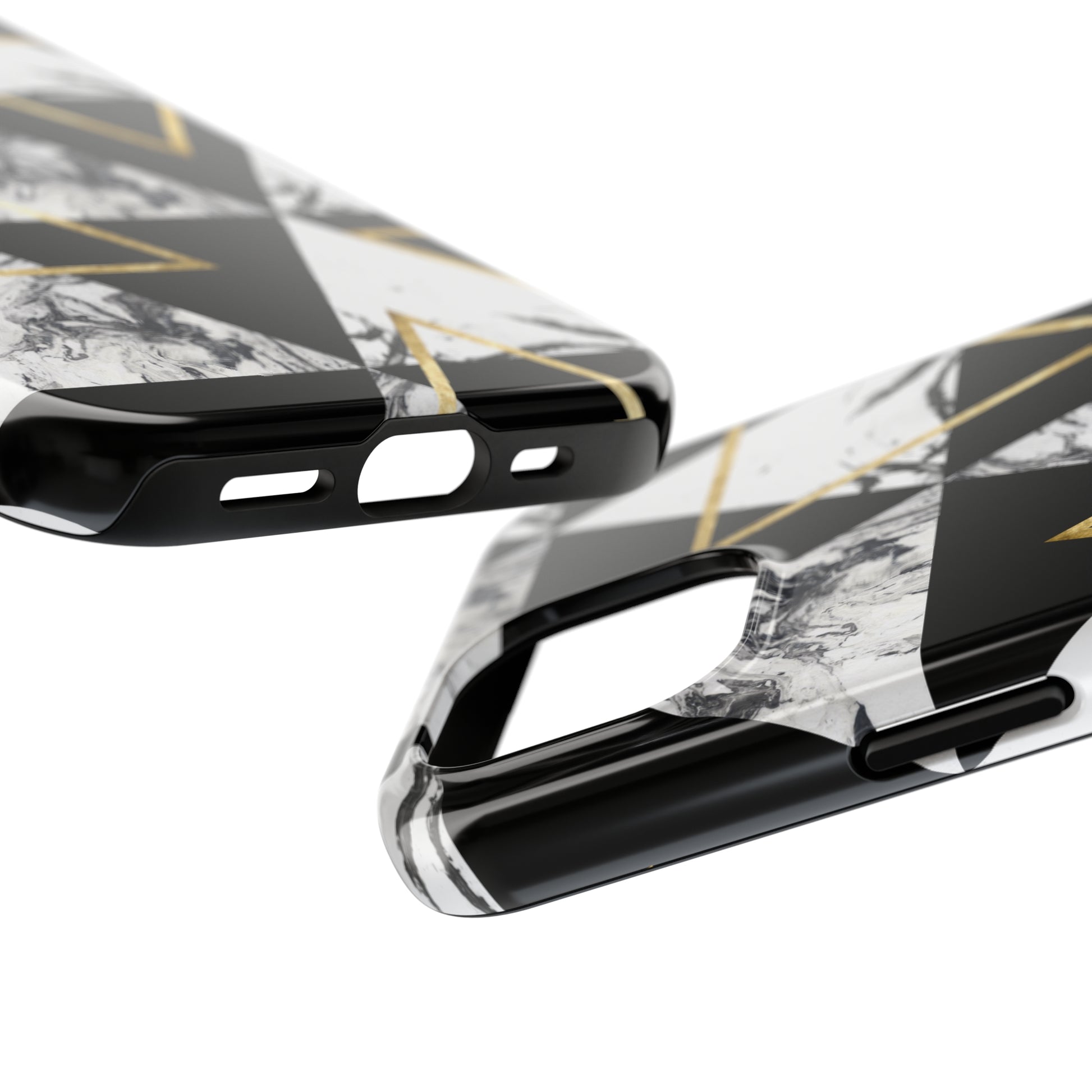 Dive into the realm of sophistication with the 'Geometric Elegance' phone case, where art meets modernism. The design features a dynamic collage of marble textures and sharp geometric shapes, all unified by a classic black and white palette with touches of opulent gold. It’s a statement piece that speaks to a refined taste and a love for contemporary design.
