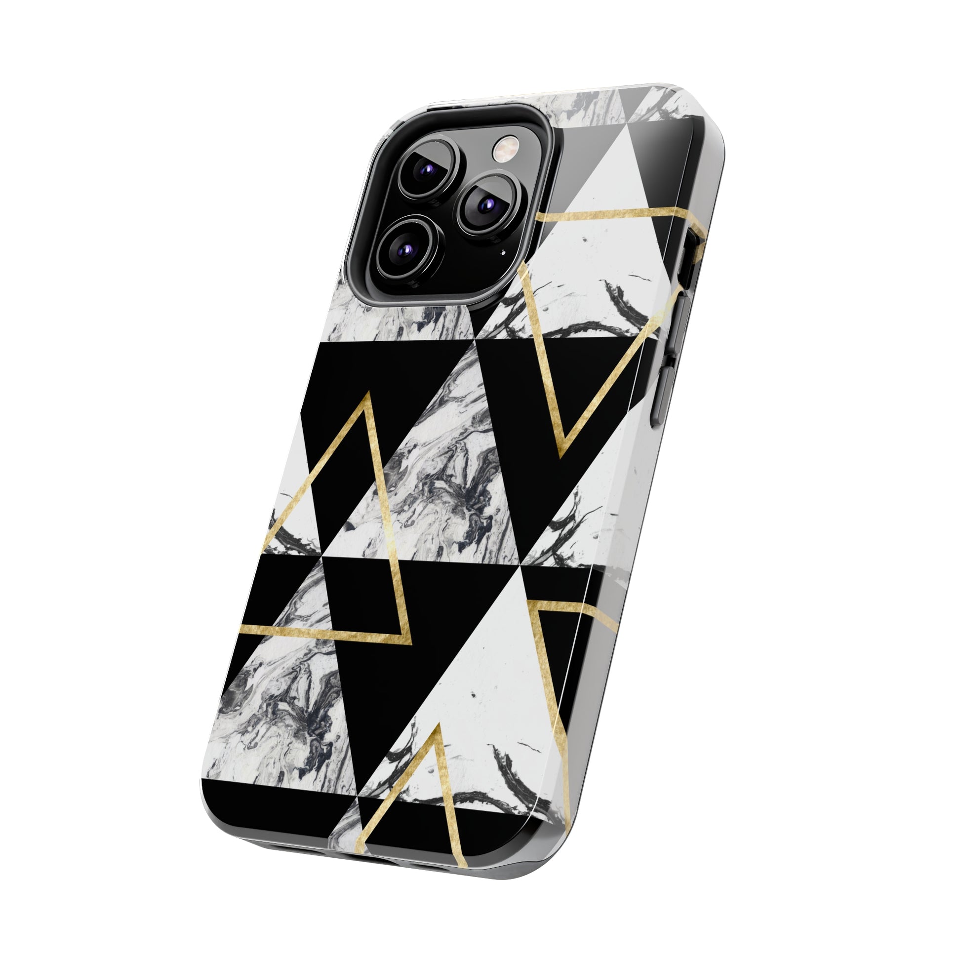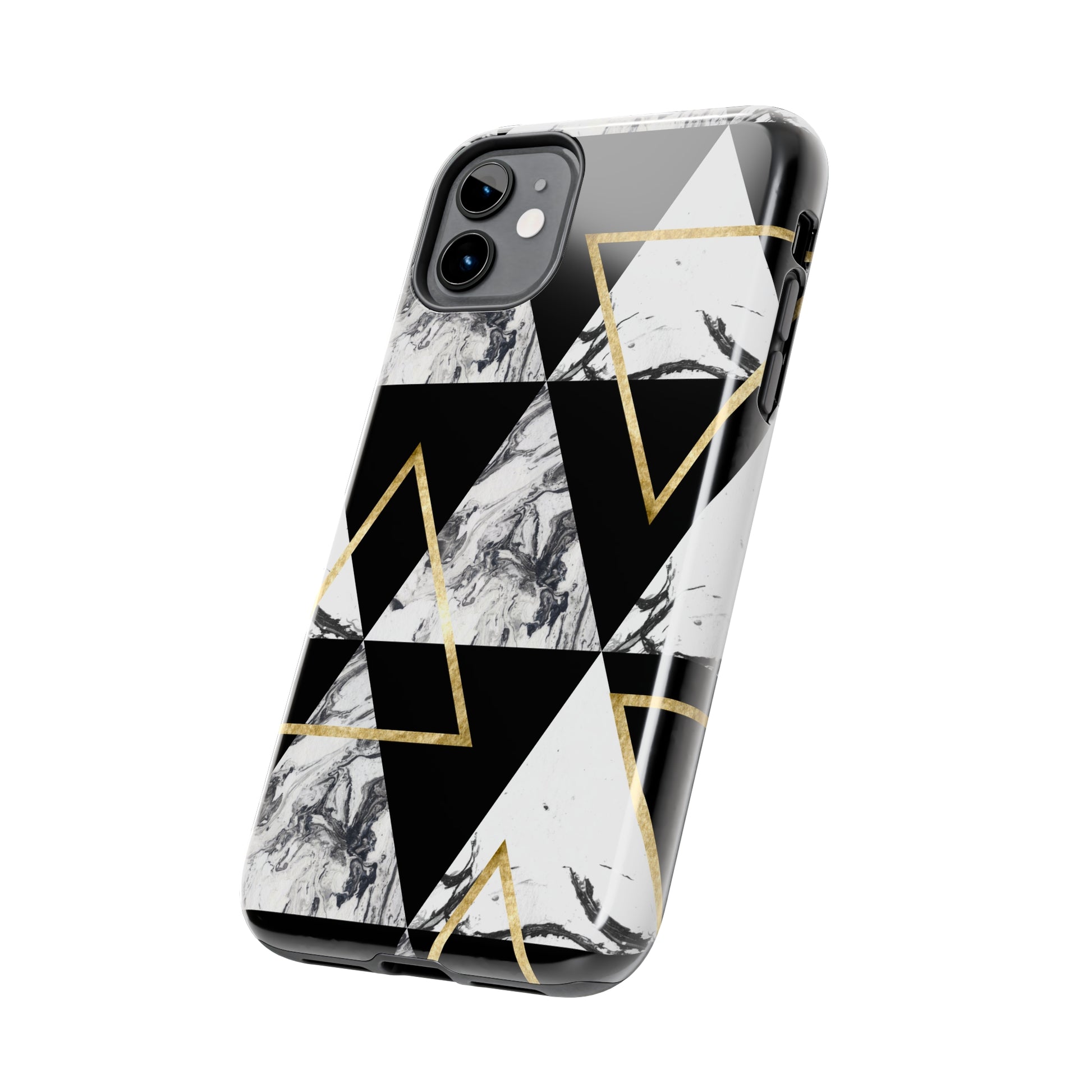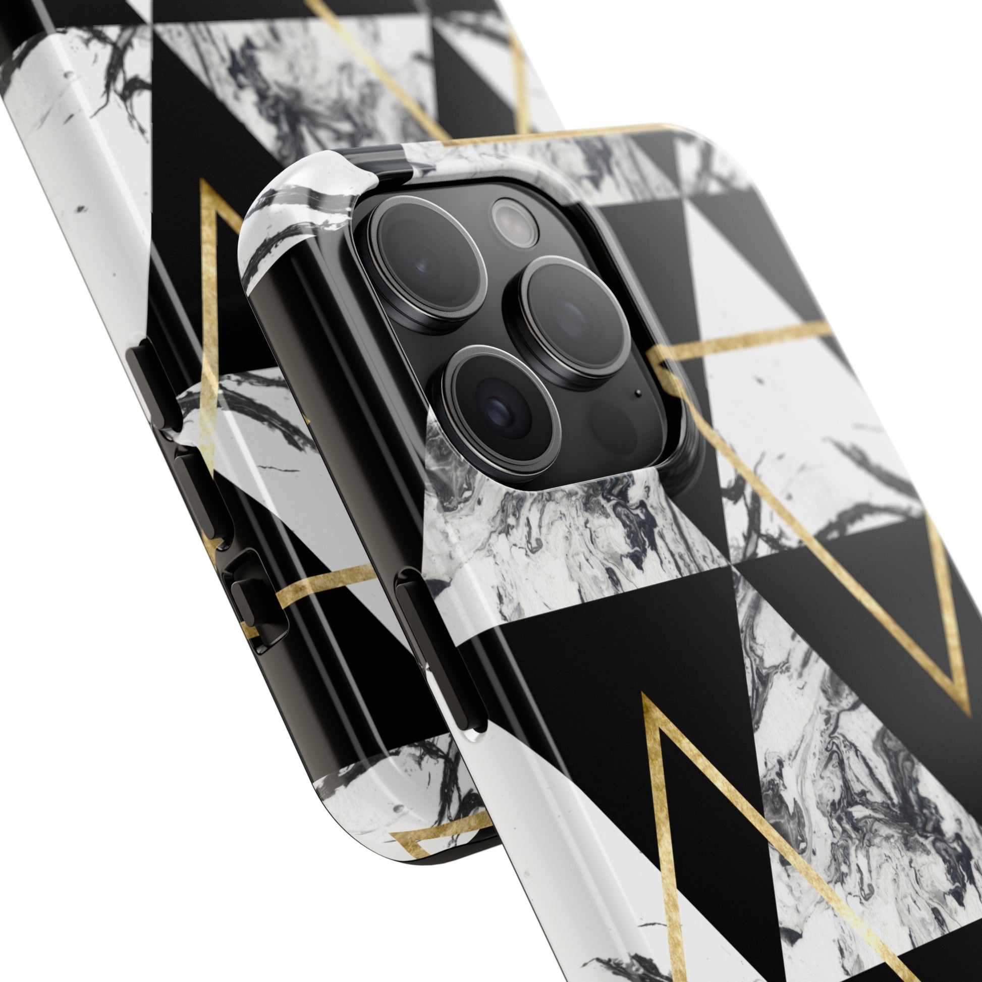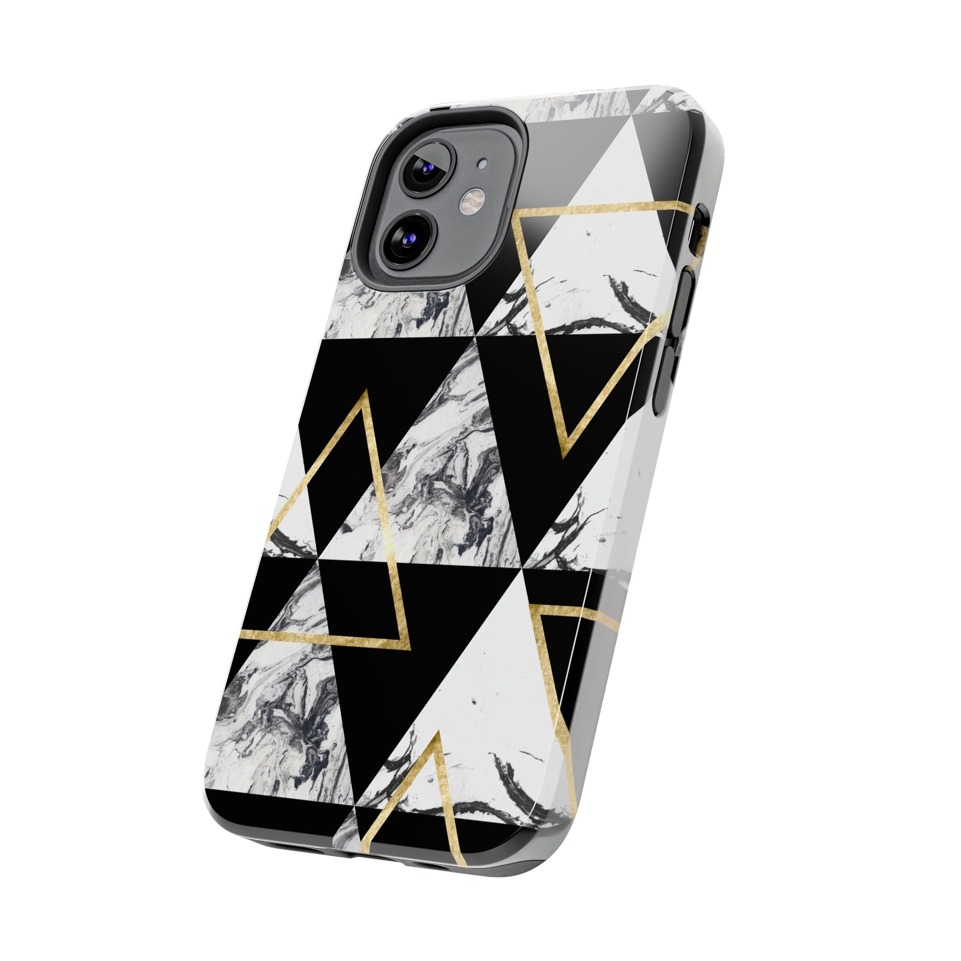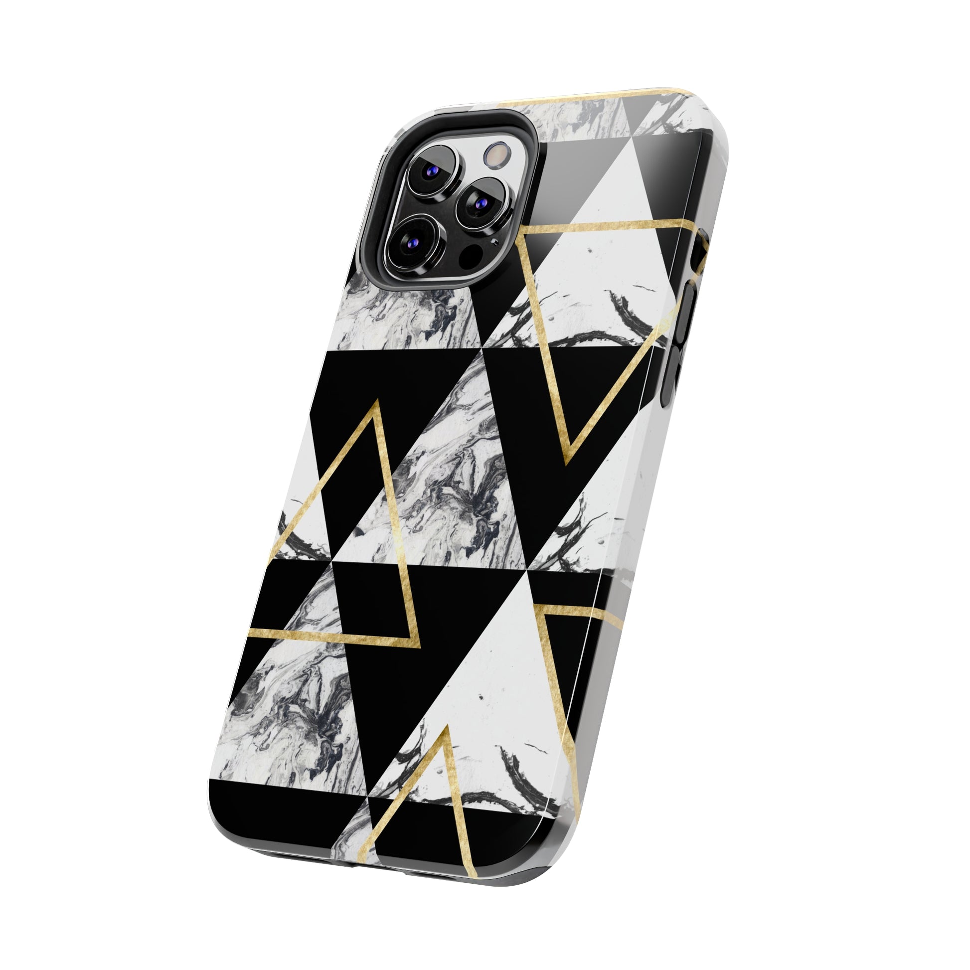 Dive into the realm of sophistication with the 'Geometric Elegance' phone case, where art meets modernism. The design features a dynamic collage of marble textures and sharp geometric shapes, all unified by a classic black and white palette with touches of opulent gold. It’s a statement piece that speaks to a refined taste and a love for contemporary design.