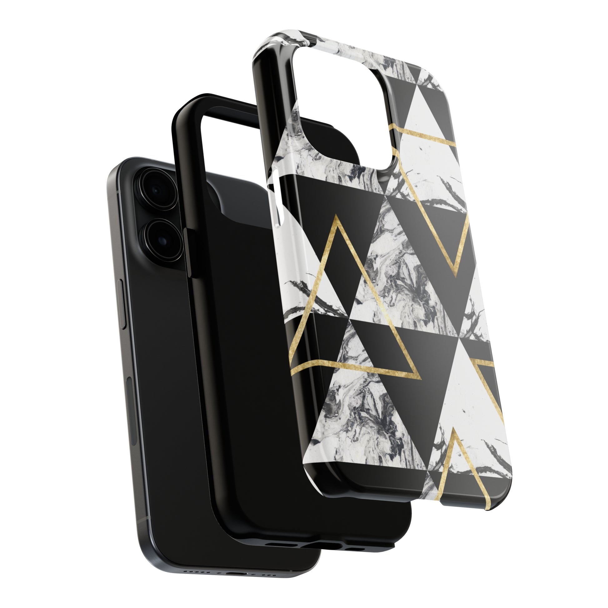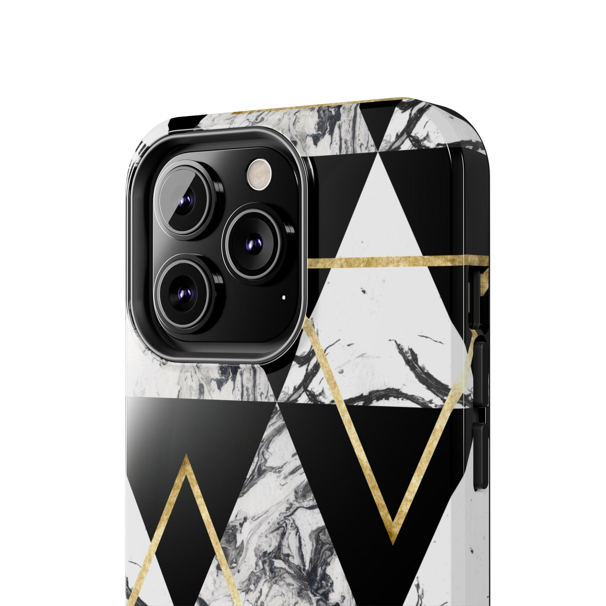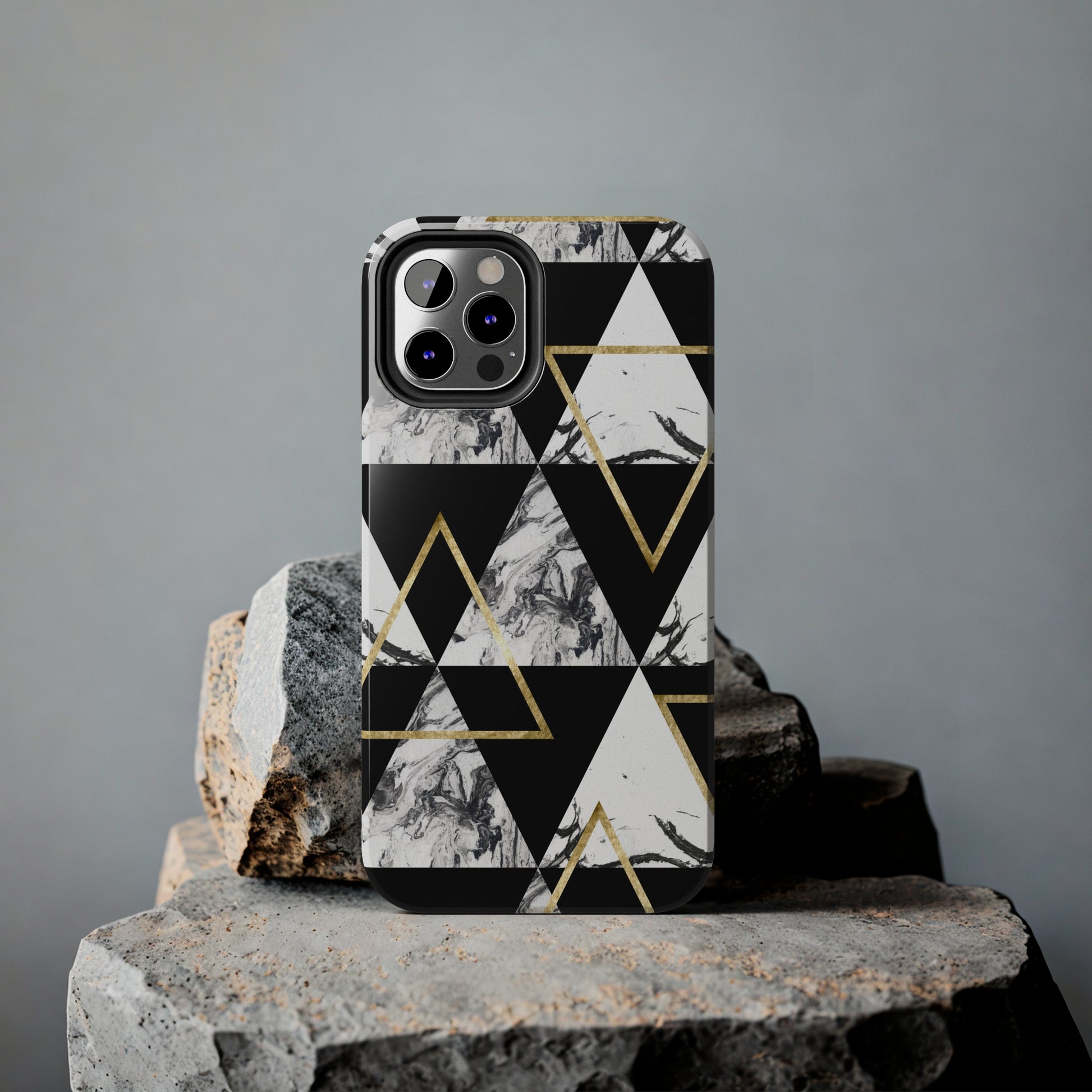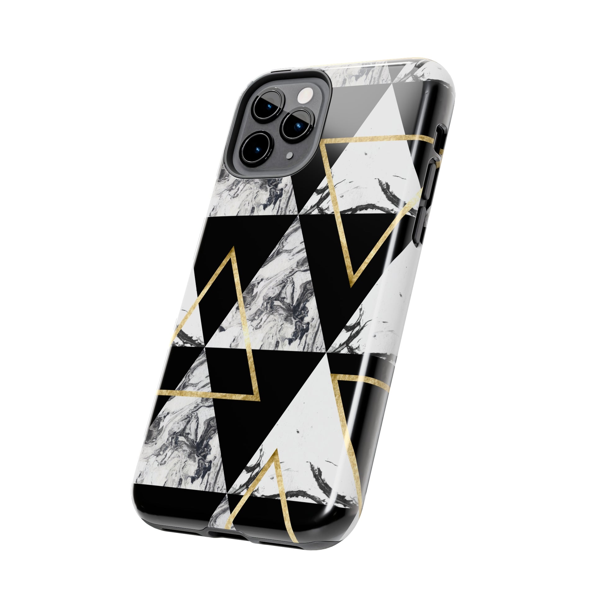 Dive into the realm of sophistication with the 'Geometric Elegance' phone case, where art meets modernism. The design features a dynamic collage of marble textures and sharp geometric shapes, all unified by a classic black and white palette with touches of opulent gold. It’s a statement piece that speaks to a refined taste and a love for contemporary design.