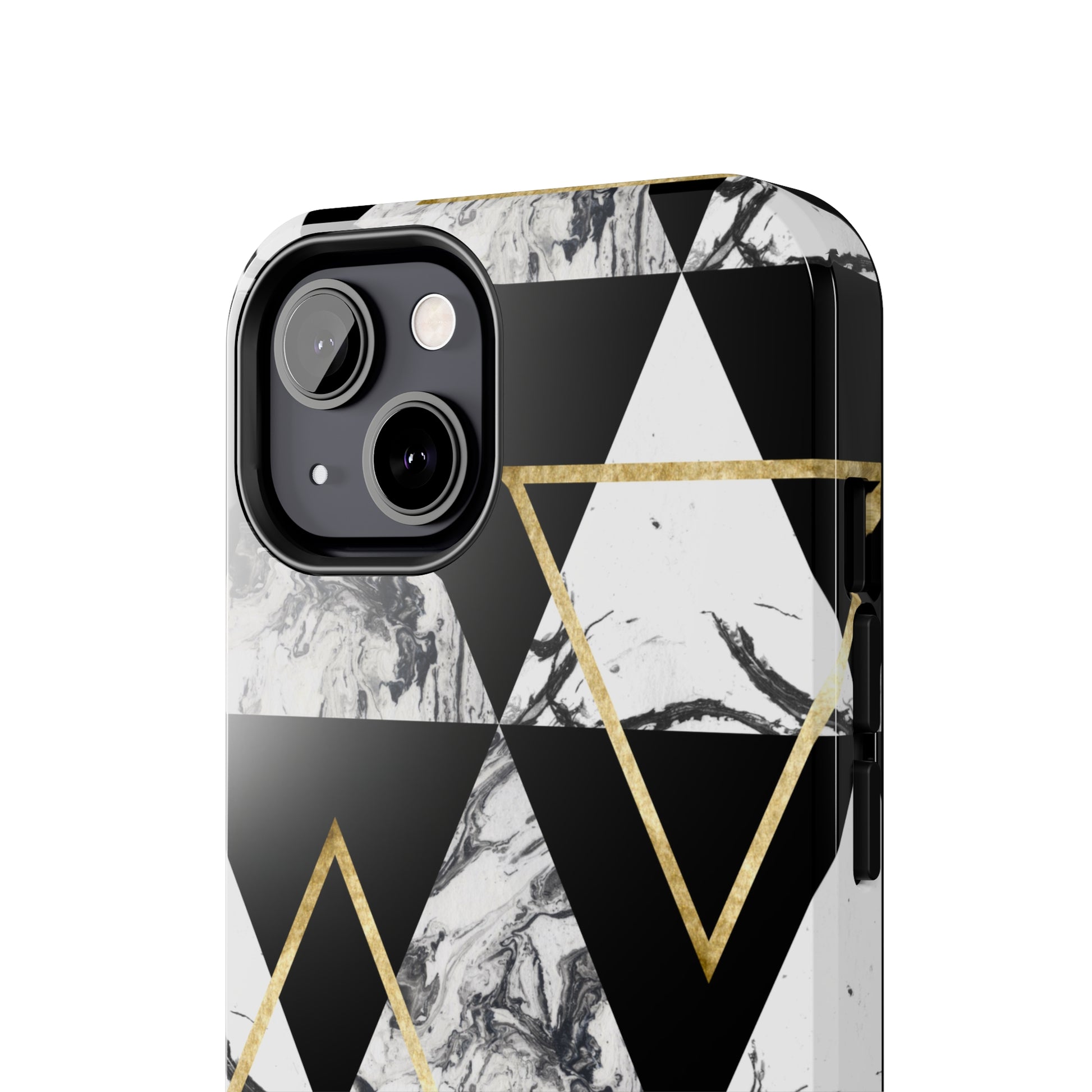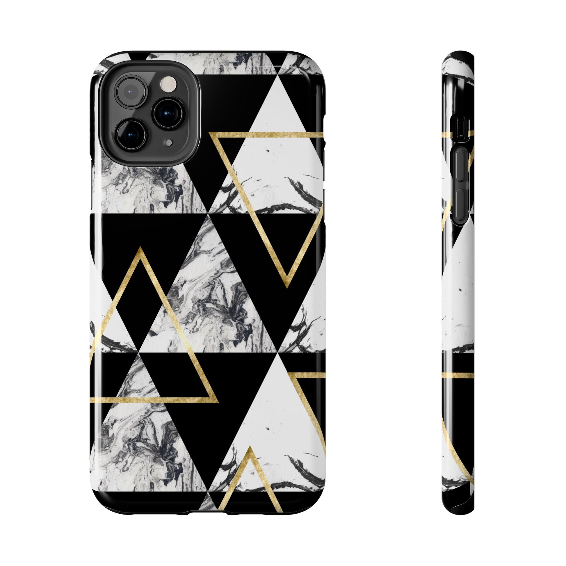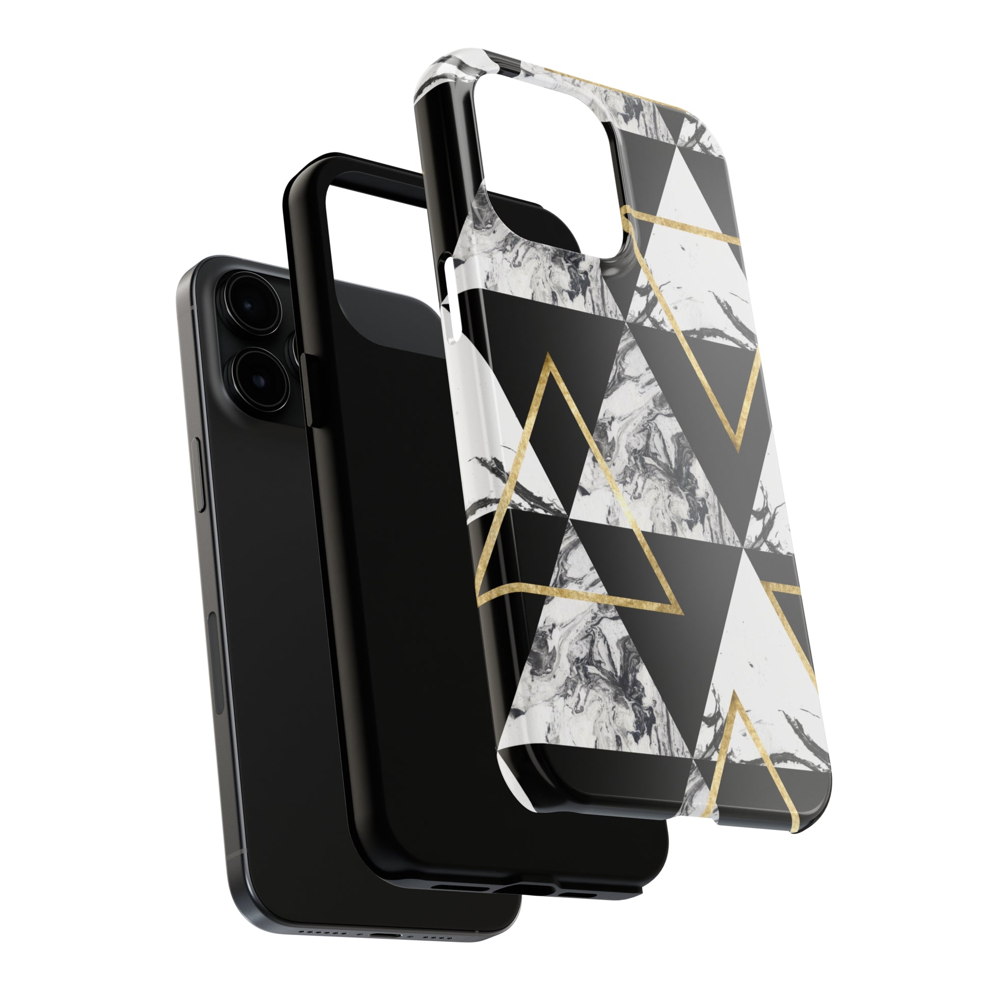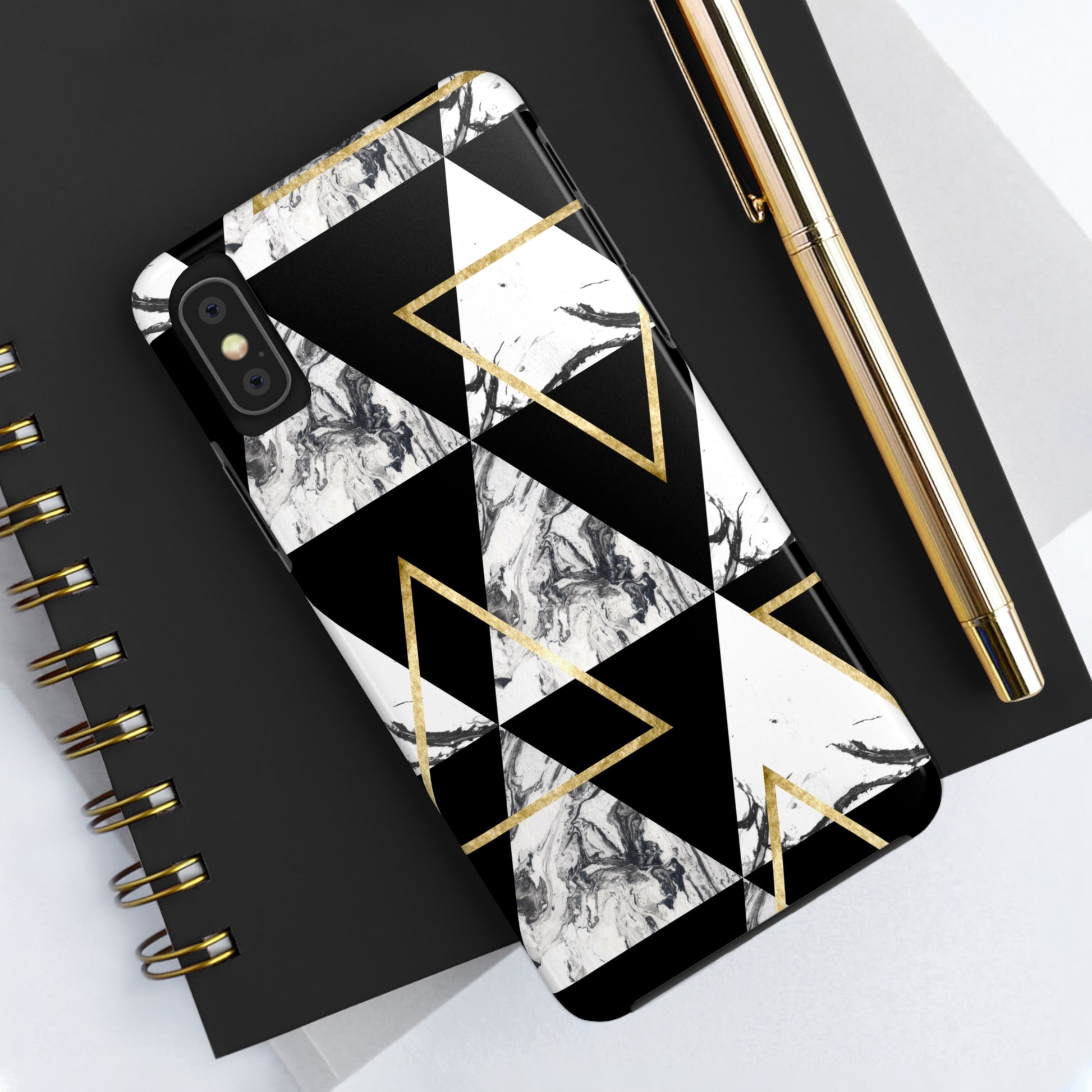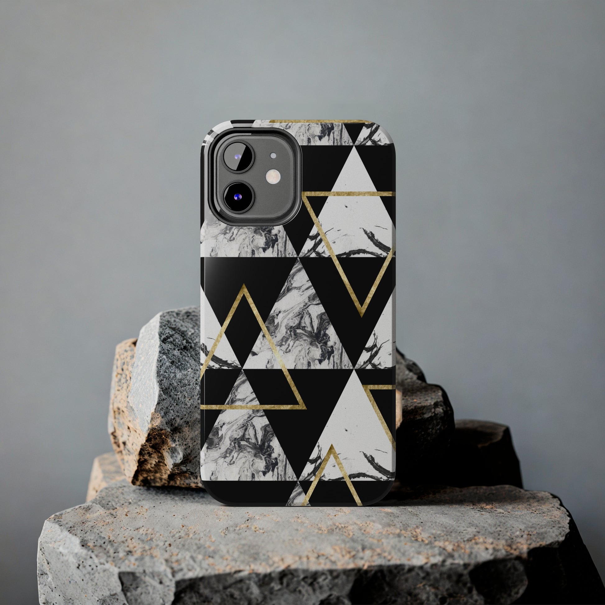 Dive into the realm of sophistication with the 'Geometric Elegance' phone case, where art meets modernism. The design features a dynamic collage of marble textures and sharp geometric shapes, all unified by a classic black and white palette with touches of opulent gold. It’s a statement piece that speaks to a refined taste and a love for contemporary design.