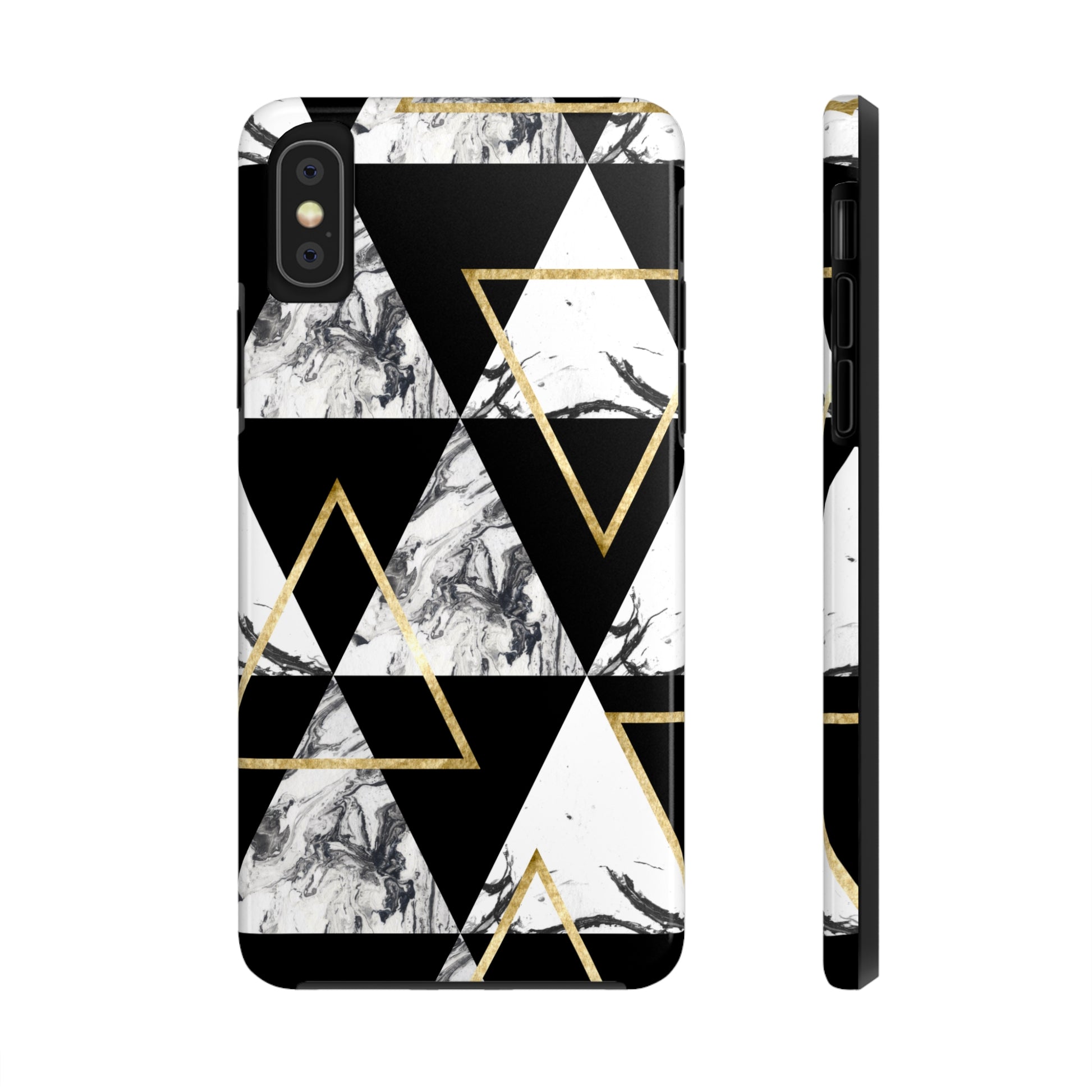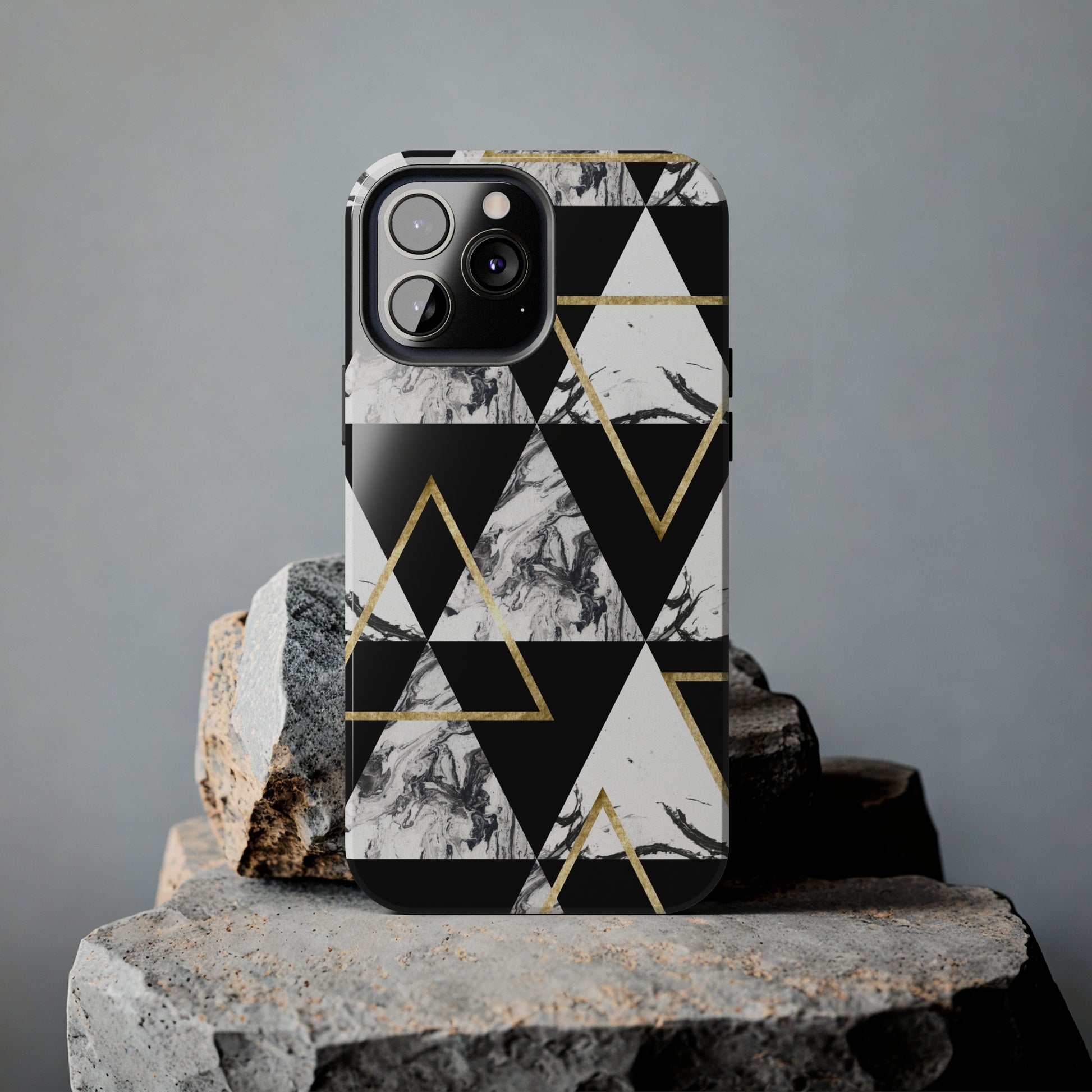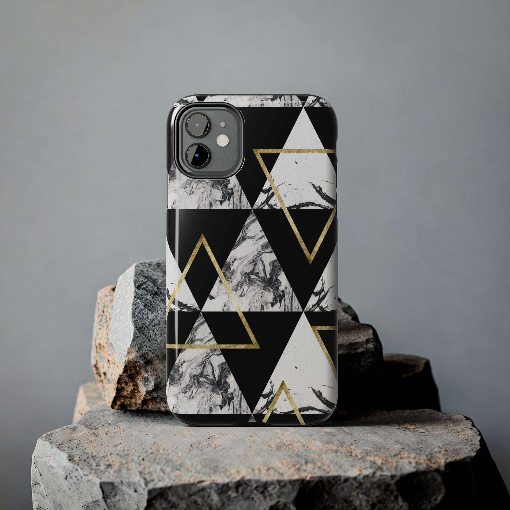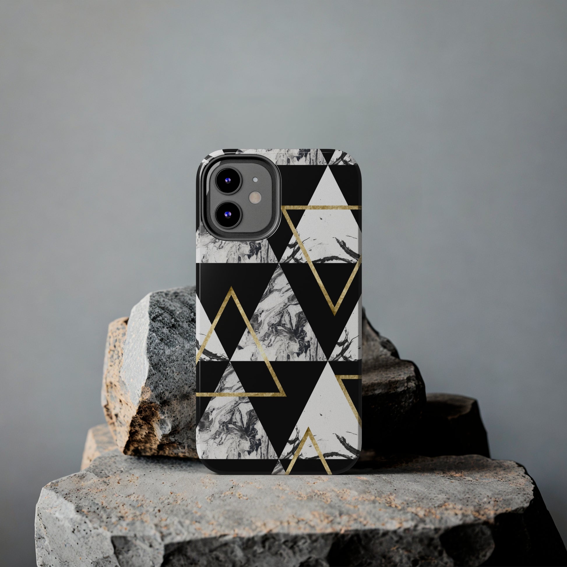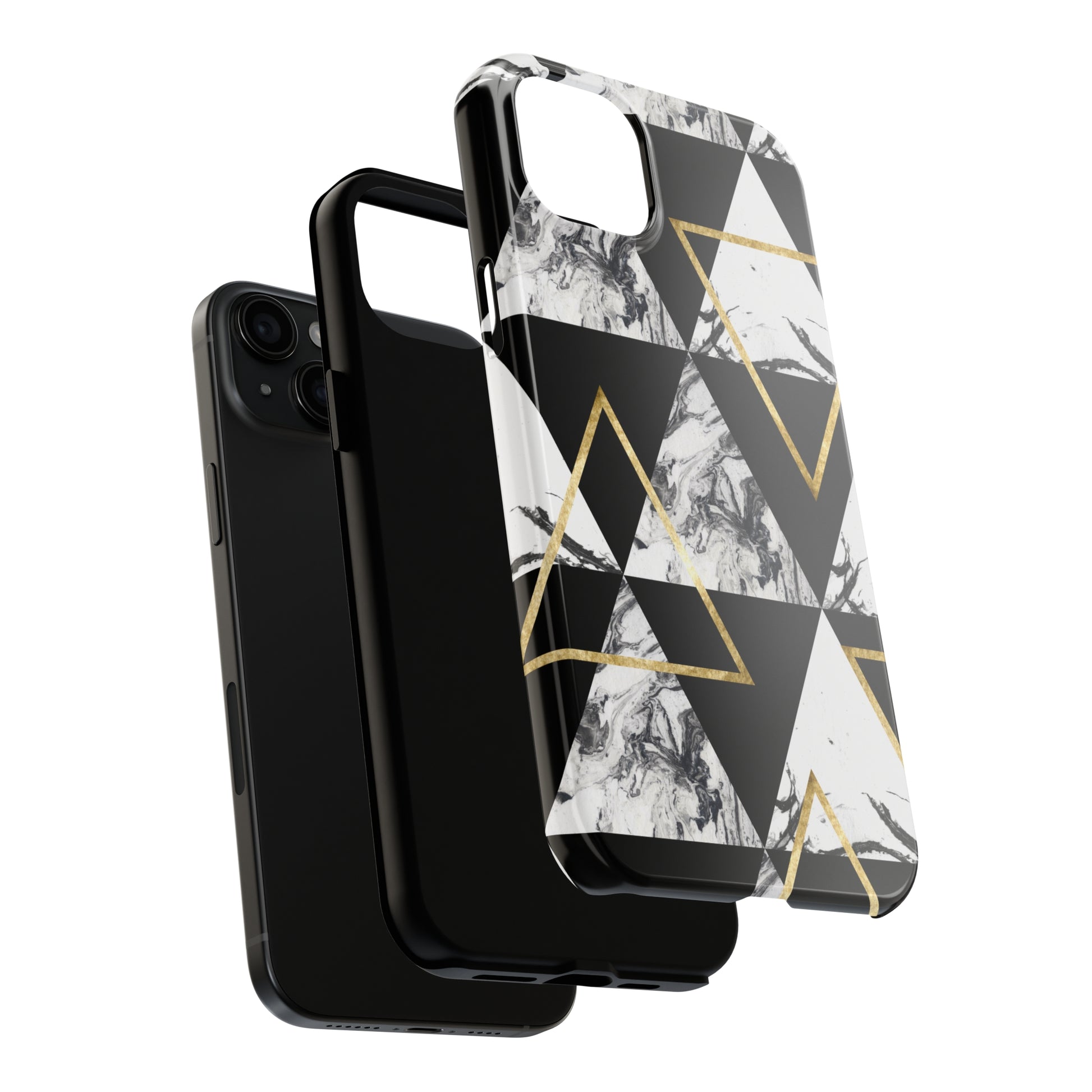 Dive into the realm of sophistication with the 'Geometric Elegance' phone case, where art meets modernism. The design features a dynamic collage of marble textures and sharp geometric shapes, all unified by a classic black and white palette with touches of opulent gold. It’s a statement piece that speaks to a refined taste and a love for contemporary design.